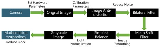 The original image captured using a low-cost camera has substantial amounts of noise and low pixel stability. Therefore, multiple image preprocessing is required to render the image suitable for subsequent analysis. As depicted in Figure 9, preprocessing mainly involves three steps: 1. Setting of hardware parameters; 2. calibration of parameters; 3. image smoothing and light normalization.