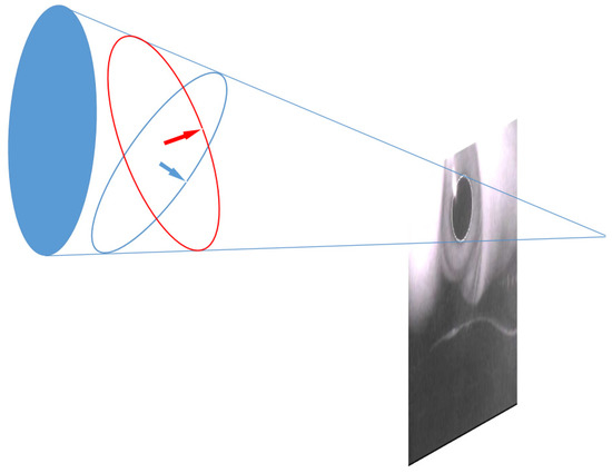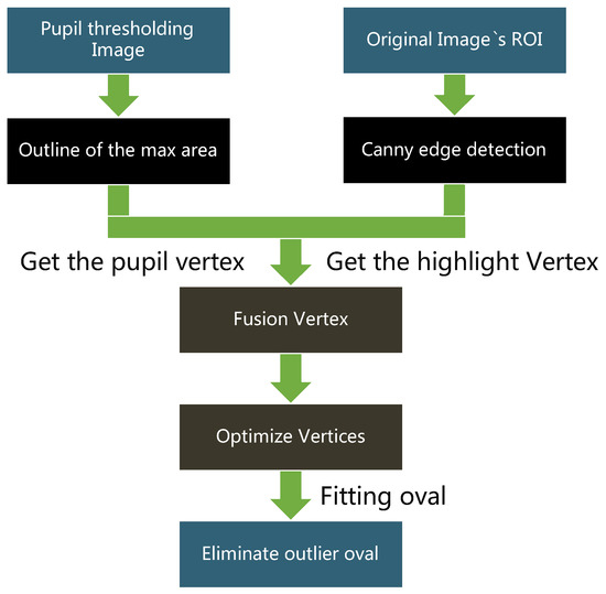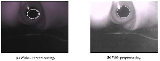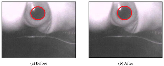 The camera parameters obtained in advance were applied to the image for reverse deformation (Figure 12). Although the resultant image may be not so obvious for distortion correction, this step is important for accurately finding the pupil and correct ellipse regions, as depicted with the red circles in Figure 12.