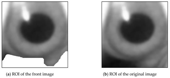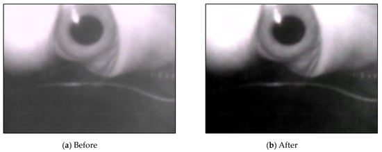 The image resolution transmitted by the camera was set to 320 × 240 pixels. The USB video device class (UVC) parameters were set to 50% brightness and 100% contrast, and the automatic white balance was set on. As depicted in Figure 10, after setting the hardware parameters, we can distinguish the background and the foreground in the original image. The boundary between the pupil and the iris was distinct, but these parameters reduced the eye reflection point.