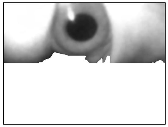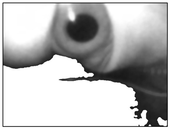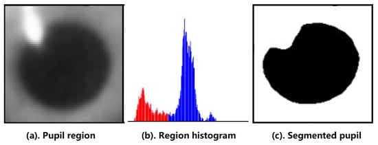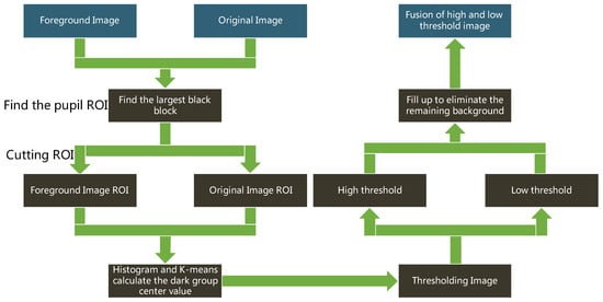 In the preprocessed image, the lower half of the image was mostly the background. The pupil can produce an imperfect ellipse that may appear distorted in various directions for a particular angle rather than a simple circle. The black blocks in the image were searched and the largest black block was selected as the region of interest (ROI). Therefore, it is necessary to remove as much of the background as possible to avoid confusion in the background for a black block when capturing the pupil block. Next, a histogram of K-means [24,25] was used. The histogram was divided into two groups and binarization images using the central average of the two groups, as shown in Figure 17.