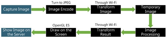The processing steps of the proposed method is shown in Figure 47. First, the computational timings of the proposed head-mounted device and processing methods are given as the following analytical results. The mobile phone encoded the captured image, and the average processing time of each image was 2 ms. The image was transmitted from the mobile phone to the computer and transmission of each image was completed in an average of 50 ms. The computer temporarily stored the image to the disk for an average of 2 ms. Image processing was performed on the computer. The average processing time per image was 0.018 ms. The processed images are transferred from the computer to the mobile phone. This transmission back to the mobile was completed in an average of 50 ms. The phone presents the results on the screen, with every image presented in an average of 5 ms. The total average processing time of the system is about 110 ms.
