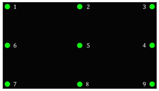 As shown in Figure 49, after the calibration process, we verified the line of sight tracking and determined the gaze point. The user gazed at each green point in sequence for 6 s. In the first 3 s, the eyes were allowed to move and stabilize. The image and coordinates were captured and returned for sampling.