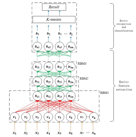 The proposed entity recognition algorithm is based on the Deep Belief Network [32] (DBN) to extract entity state information and user access features, and then uses K-means clustering [33] algorithm to perform unsupervised division of entity categories. The principle of the algorithm is shown in Figure 3. It mainly includes two parts: entity feature extraction and entity recognition classification.