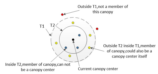 - Define T1 and T2 as thresholds of Canopy radius through cross-validation, where T1 > T2.
