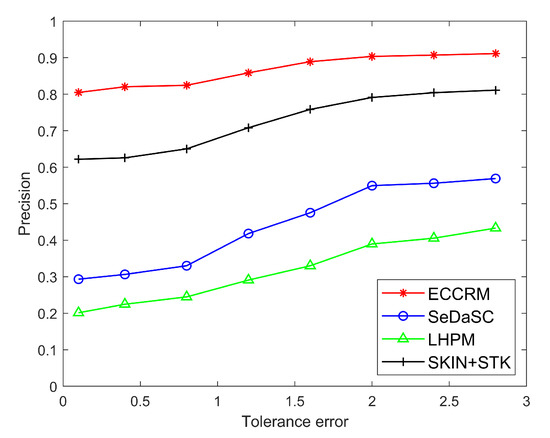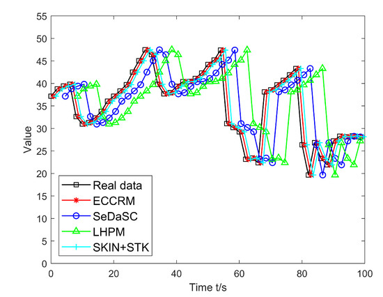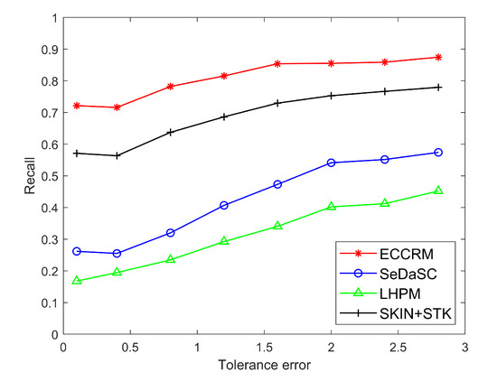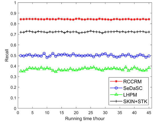 Figuress Figure 12 and Figure 13 show the precision and recall of the results as the algorithm’s running time increases. It can be seen that the stability of the precision and recall of the ECCRM scheme is higher than SKIN+STK, SeDaSC and LHPM schemes. This is due to the strong time variability of hot entities. In ECCRM scheme, because the edge server is close to the user, the delay in results from the edge server is relatively short. The matching rate between search results and the current state of the entity is higher, so the precision and recall are less volatile; In the SeDaSC scheme, the delay of long-distance communication is large. Before user obtains the results, the probability of the entity state changing is relatively high, so the results do not match the current state of the entity, which makes the precision and recall fluctuate significantly. In the LHPM scheme, after the gateway receives and parses the user’s request, it needs to access the sensors matched by the search request and obtain data. Because the communication distance is too long, the entity state has changed when the results are returned, so the accuracy rate and recall rate fluctuate greatly. It is worth noting that even SKIN+STK scheme stores data at the edge, but it must decide whether relevant search results can be directly returned from n-hop neighbor regions when searching. If not, it needs to access the corresponding sensor to get search results, thus the accuracy rate and recall rate fluctuate greatly.