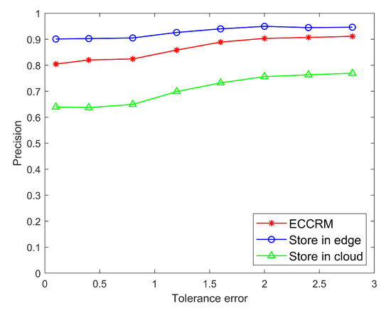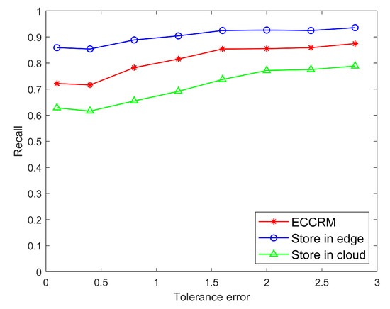 Figure 10 and Figure 11 are comparisons of the precision and recall of different entities store scheme under different user tolerance errors. It can be seen that when all data under not classified and stored in the edge, the precision and recall are the highest. Because the short delay in searching data from the edge server, the search results are closer to the real data. Because the data stored in the cloud contains cold entities with weak time variability, it ensures the precision and recall of cloud storage solutions has improved. However, centralizing the storage of data consumes a lot of computing and storage resources. Due to the weak time variability of cold entities, there is no significant difference in search results when entities stored on the edge or in the cloud. However, searching for the hot entities requires very timely feedback. Therefore, it is unwise to store all data on the edge or in the cloud, which will cause unnecessary waste of computing and storage resources. While our algorithm was designed with consideration of how to save bandwidth and storage resources. In our scheme, storing hot entity information in the edge can save the communication bandwidth of uploading data to the cloud and the storage resources of the cloud. Moreover, recommending entity information through our recommendation algorithm can save the search spending of the user, so as to save the communication bandwidth between users and servers. In summary, our scheme is more applicable than other schemes.
