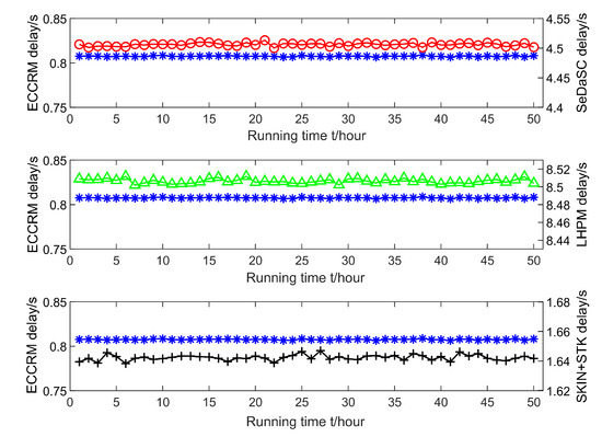 Figure 14 shows the fluctuations in the latency of searching data from the edge server and the cloud server as the running time of the algorithm increases. It can be seen that with the increase of the algorithm running time, the fluctuation of the time-consuming delay of the ECCRM scheme are smaller than the SKIN+STK scheme, the SeDaSC scheme and the LHPM scheme. This is because the communication distance between the user and the edge server is short, and the communication is more stable, so the fluctuation of delay is smaller. The communication distance between the cloud server and the user is too long. The number of terminals communicating with the cloud server at the same time is huge, and the probability of congestion or queuing is higher, so the fluctuation of delay is small. The SKIN+STK scheme is very special. It never uses cloud server to store data, but obtains data from nearby n-hop edge servers. The delay increases with the number of hops, thus the delay fluctuates significantly.