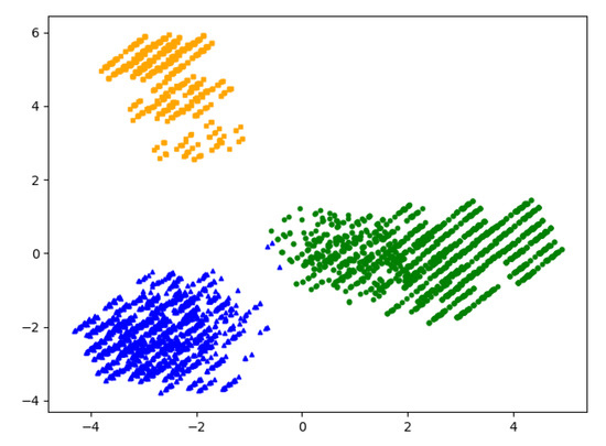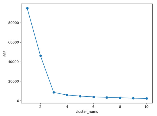 Figure 15 shows the simulation results of clustering by the Canopy algorithm. It can be seen that the algorithm obtained 3 Canopies, so the K value of the K-means clustering algorithm was determined as 3. Figure 16 shows the results of the K-means clustering algorithm. It can be clearly seen that the user set has been divided into three interest groups. To ensure that the selection of K value is correct, calculated the within cluster Sum of Squared Errors (SSE) at different K values, determine the choice of K’s value through the Elbow Method [43]. It can be seen from Figure 17 that when K = 3, the distortions are the largest, so that the choice of K’s value is correct.