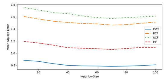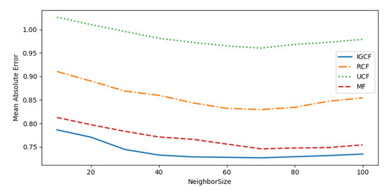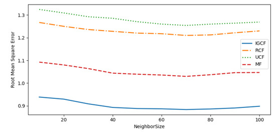 As can be seen from Figure 18, Figure 19 and Figure 20, the recommended accuracy of the IGCF algorithm proposed in this paper is higher than the other algorithms, and each algorithm performs best when NeighborSize = 70. The UCF algorithm obtains the nearest neighbors of similar users by calculating the cosine similarity, while the cosine similarity is not sensitive to absolute values, and the error calculated in the scoring matrix is large, so the result is the worst. The RCF algorithm predicts the user’s rating of an entity based on the linear regression. When the user’s rating data is sparse, the error of the prediction result will increase, so the effect is not good. The MF algorithm takes into account the sparseness of the scoring matrix, and obtains a more efficient matrix through dimension reduction before measuring the relevance of the user, so it is better than the UCF algorithm and the RCF algorithm. However, because it is the correlation of all users in the calculation matrix, errors are easy to occur. The user group is not considered to be prioritized, and the similarity between users is calculated in the divided user group to reduce errors. Therefore, the MF algorithm performs worse than the algorithm proposed in this paper. Table 2 shows the comparison of algorithm results when NeighborSize = 70.