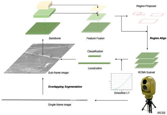 The overall architecture of the proposed method to address target recognition in the infrared circumferential scanning system (IRCSS). We perform the overlapping segmentation on the single-frame image of IRCSS. After getting the sub-frame image, it is sent to the recognition network. The backbone structure is detailed in Section 4. The feature fusion follows the design in the feature pyramid network (FPN) [15]. The region proposal network (RPN) and the region convolutional neural network (RCNN) subnet follows the design of the Faster RCNN [16]. The region proposals are processed by RoI align [17]. In the bounding box regression for target localization, the loss function is the smoother L1.