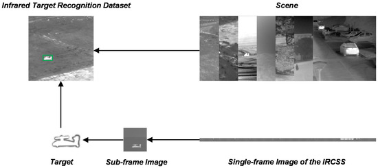 When the field of view expands, there will be more interference in the imaging results of the IRCSS, such as clouds in the low-altitude background, and mountains and trees in the ground background, all of which make target recognition more challenging. However, most of the previous works only finished the target detection [5,6]. Our method is to upgrade the function of the IRCSS. Target recognition involves two levels of understanding of the target. Firstly, where is the target? We need to perform detection, deciding whether the target is in range, and localize it if it is. Secondly, what is the target? We need to perform identification, classifying the target. In the past, traditional hand-crafted methods took different algorithms for two subtasks—for example, threshold segmentation [7] for target localization, a histogram of oriented gradients (HOG) [8] for features extraction, and a support vector machine (SVM) [9] for classification. The representative work in this paradigm is the deformable part models (DPM) [10]. However, independence between algorithms becomes an obstacle to further enhance recognition performance. Since AlexNet [11] became the preferred option in ILSVRC 2012, there has been a strong interest in deep learning for computer vision, especially the deep convolutional neural network (DCNN). The DCNN has the structure of stacking various blocks, such as convolution layers, activation functions, pooling layers, and fully connected layers, which endows the network with a powerful feature extraction ability to automatically and adaptively obtain deep semantic information. In the target recognition field, DCNN-based methods utilize a network to accomplish two subtasks, realizing end-to-end processing. In learning-based models, DCNN-based methods need large-scale datasets, including images and annotations, to train the networks with a strong generalization ability. Owing to the access to large-scale datasets for the public, such as ImageNet [12], COCO [13], VOC [14], the performance of DCNN-based methods on visible images has been dramatically improved. However, in the infrared field, publicly available datasets are mostly used for target tracking, which are usually sequences of infrared images. Unfortunately, these datasets are unsuitable for infrared target recognition.