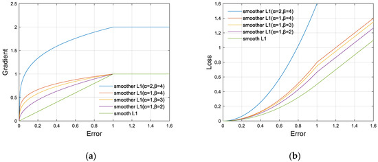 where controls the gradient of outliers, and controls the changing trend of the gradient of inliers. The larger or smaller the , the closer it is to L1 loss or the smooth L1. L1 loss can be regarded as the smoother L1 as , , and the smooth L1 can be regarded as the smoother L1 as , . For the optimal setting of and , we did a coarse grid search in the experiment. We integrated the gradient formula to obtain the formula of the smoother L1: