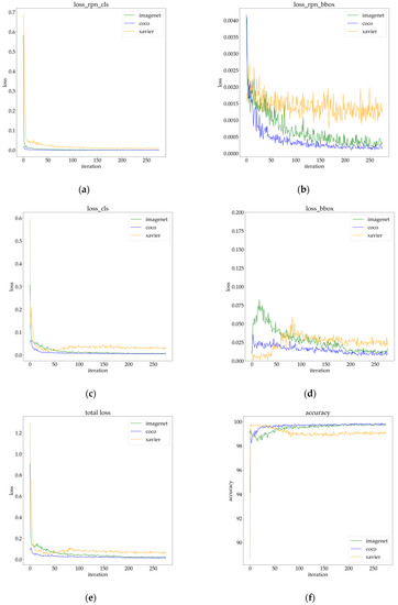 The visualization of training: (a) classification loss in RPN; (b) localization loss in RPN; (c) classification loss; (d) localization loss in bounding box regression; (e) total loss; (f) accuracy.