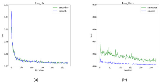 The visualization of training with the smoother L1 () and the smooth L1: (a) classification loss; (b) localization loss in bounding box regression.