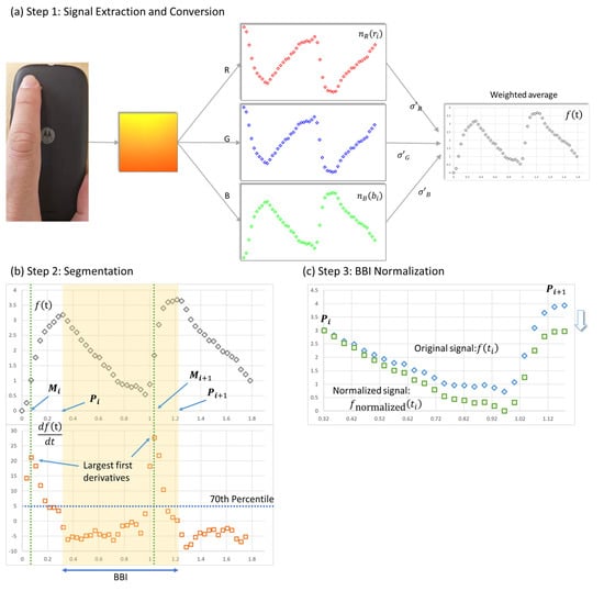 For each data collection session, a self-developed app first activated the in-built flashlight and recorded 120 × 160 pixel videos with approximately 30 frames per second (the actual frame rate was determined by the underlying operating system) (see Figure 1a). Raw YUV-format picture frames retrieved from the preview function were then converted into the RGB format. Then, the input signals from the three color channels (red, blue, and green) were normalized using the 100-point moving average () and standard deviation ():