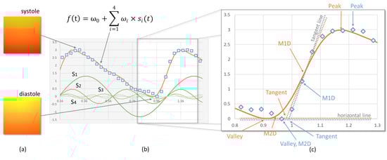 Two families of functions have been used to describe the pulse waveform: Gaussian (or modifications, such as the Rayleigh functions) [,,,] and sinusoidal functions. Since sinusoidal functions are more commonly used in hemodynamic studies (i.e., Fourier analysis) to predict health-related variables [], and are less computationally demanding, this study fit the pulse waveform with the sum of sinusoidal functions.