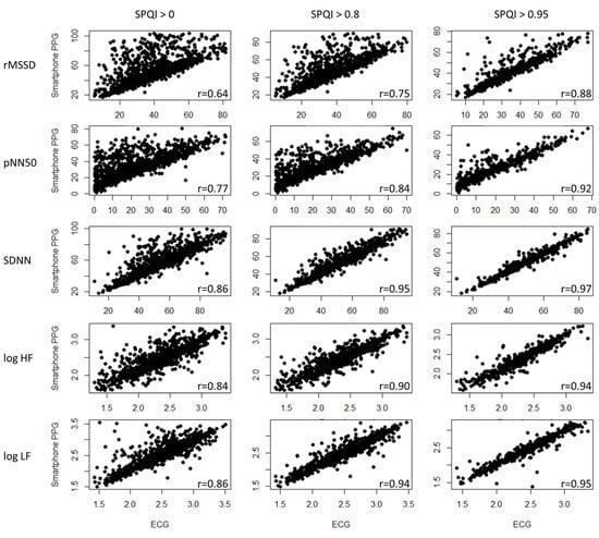 The advantage of using the SPQI is also apparent from the scatter plots (Figure 3). When all data are included, a significant portion lies away from the straight line; when corrupted data are filtered out, a higher portion of the data lies along the straight line. In particular, there is an asymmetric bias for rMSSD and pNN50. Smartphone PPG tended to produce larger values for these measures when the signal quality was low, and therefore, their correlation coefficients were lower. Since rMSSD and pNN50 are more susceptible to the randomness of the samples, the benefits of using the SPQI were also more prominent for these two measures. When we filtered the data with an SPQI threshold level of 0.95, the correlation coefficients for rMSSD and pNN50 increased from 0.64 and 0.77 to 0.88 and 0.92, respectively.