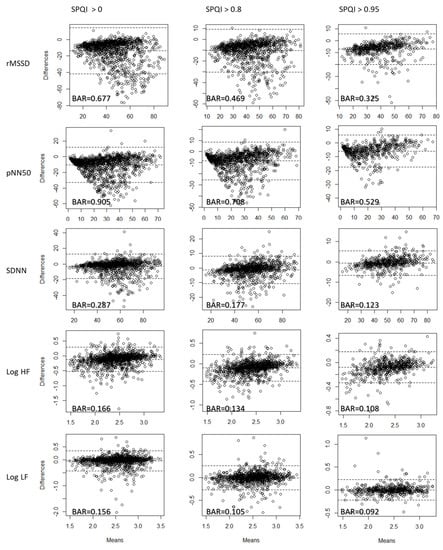 The effect of the SPQI can also be observed from the Bland–Altman plot (Figure 4). Considering data generated by Tangent, the number of points that lie beyond the upper and lower agreement limits was significantly reduced when the data were filtered with the SPQI. The same pattern was observed for all HRV measures. Similar to the correlation coefficient analysis, rMSSD and pNN50 showed the least agreement among HRV measures. Although filtering with an SPQI > 0.95 could significantly reduce the BAR, these two measures were still above the “acceptable” level for all FPDTs.