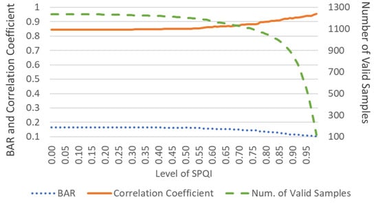 However, when the data set was filtered with an SPQI > 0.95, the reduction in the number of samples was not negligible (see Table 4). On average, the number of samples decreased by 14% (from 1263 to 1060) and 56% (from 1263 to 557) when the data were filtered out by thresholds above 0.8 and 0.95, respectively.