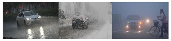 The more common weather scenes of intelligent vehicles include rainy days, snowy days, and foggy days, as shown in Figure 2.