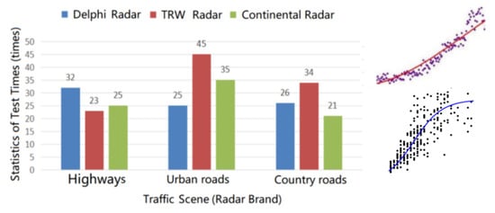 According to the analysis of the ground clutter mechanism, the usual power spectrum distributions of ground clutter include the Gaussian, Cauchy, and Omnipolar distributions. For intelligent driving millimeter wave radar, we used the statistical analysis toolbox of MATLAB 2019 software. The ground clutter statistical fitting analysis of intelligent driving millimeter wave radar was performed using the measurement data from Delphi radar, TRW radar, and Continental radar in the multi-traffic road scene, as shown in Figure 5. The data used in the fitting analysis were from 266 actual road tests of the millimeter wave radar conducted from 2017–2019, and the test scenes consisted of highways, urban roads, and rural roads.