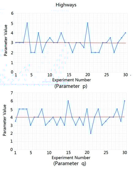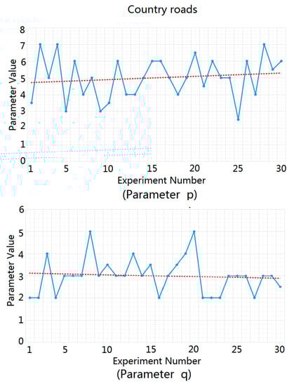 For highways, urban roads, and rural roads, we carried out statistical analysis and fitting experiments for the ground clutter data of 30 different traffic scenes using MATLAB software. We substituted the measured ground clutter data into the Weibull distribution function in order to solve the parameters and and then averaged the parameter values obtained from 30 parameter solution processes in order to obtain the recommended values of and in the three traffic road scenes, as shown in Figure 7, Figure 8 and Figure 9. In these figures, the blue dots represent the solution values of and in each experiment, and the red dotted lines represent the estimated average values of and , which were used as the recommended values for and .