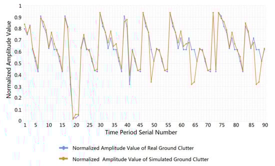 In addition, we compared and analyzed the statistical error between the actual road clutter data and the ground clutter simulation data, which obeys the power spectrum of the Gaussian distribution and the amplitude probability density of the Weibull distribution. After randomly selecting 90 sets of actual road clutter data, each with a time period of 5 s, we calculated the average amplitude of the clutter time domain signal for each time period. At the same time, we utilized the above statistical distribution characteristics to generate simulated clutter data and to calculate the average amplitude of the simulation clutter data. On this basis, we normalized the amplitude data, and the error between the actual ground clutter and the simulated ground clutter was calculated. The error statistics comparison results are presented in Figure 10. From this comparison, we can see that the error between the actual clutter and the simulated clutter is smaller and the consistency is better.