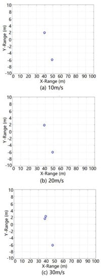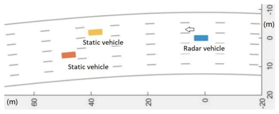 The center frequency of the radar carrier was 77 GHz, the sampling rate of the radar was 50 MHz, the frequency modulation of the radar was 16.7 μs wide, the bandwidth was 500 MHz, and the transmission power was 25 dBm. The antenna was set to single-shot and multi-receiver, the receiving antenna was a line array, the number of channels was 6, and there were 128 distance-dimension fast Fourier transform (FFT) processing points and 128 speed-dimension FFT processing points. The spatial positions of the two stationary strong scattering targets (cars) are illustrated in Figure 15. In this figure, the radar vehicles are blue, the stationary vehicles are yellow and orange, and the stationary vehicles are 37 and 44 m away from the radar vehicles. The parameters of ground clutter, and , are 3 and 4, respectively. The radar has speeds of 10, 20, and 30 m/s.