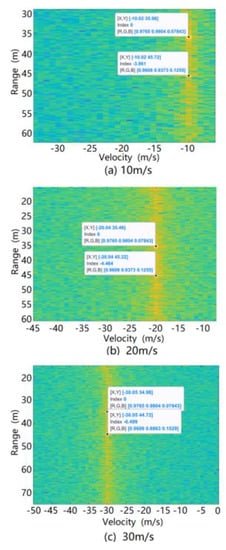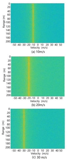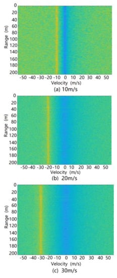 The simulation was carried out using the above ground clutter modeling method. The spectrum formed by the range and relative velocity (i.e., the Range Doppler (RD) spectrum) of the ground clutter at different speeds of the radar is shown in Figure 16. It can be seen from this figure that due to the motion speed of the radar carrier, the ground clutter spectrum migrates from the zero-intermediate frequency to the radial speed of the radar carrier. At the same time, since there are two stationary vehicles in the scene, the radar reflection intensity of a vehicle is higher than the road reflection intensity, so two strong scattering bright spots appear at 37 and 44 m on the spectrum.