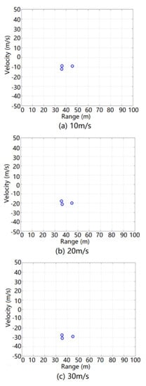 The simulation results of the ground clutter RD spectrum after MTD processing also need to be processed using radar CFAR detection. The simulation results after radar CFAR detection processing at relative speeds of 10, 20, and 30 m/s are shown in Figure 19.