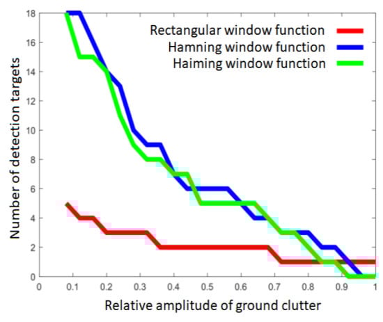 In addition, considering the direct influence of the relative amplitude of ground clutter on the radar detection results, we selected the rectangular window processing function, Hanning window processing function, and Hemingway window processing function, all of which are commonly used in actual radar, and applied the above ground clutter modeling method and the ground clutter simulation data generated by the simulation scene in order to calculate and plot the influence curve of the ground clutter amplitude on the number of radar detection targets, as shown in Figure 21.