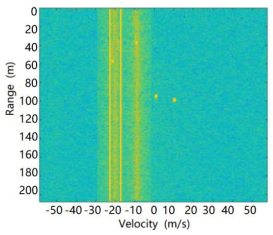 In the high-speed road scene with heavy rain, the synthetic RD spectrum of the target echoes and environmental clutter received by the radar are shown in Figure 23.
