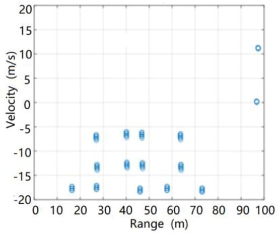From the ground clutter modeling simulation, the position of the stationary vehicle in the RD spectrum of the ground clutter was determined, as shown in Figure 17.