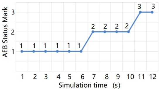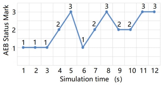 The test results are shown in Figure 27 and Figure 28 below, in which 1 indicates that the AEB system has not started, 2 indicates that the AEB system is in the warning state, and 3 indicates that the AEB system is in the braking state. The test results of the AEB decision algorithm without the support of the radar environmental clutter simulation data were then compared and analyzed.