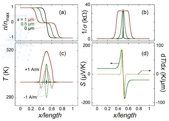 Because of a low at zero doping, the Joule heating is maximal in the center of the graphene strip. It is seen that (Figure 2c) changes in agreement with the curves (Figure 2a). The wider the region of zero doping the wider the . The change from heating () to cooling () occurs because of the Peltier effect, which is a substantial source of temperature variation. The temperature gradient and Seebeck coefficient are shown in (Figure 2d). The integral of their product gives the overall TEP signal. Clearly, only the parts of the strip where contribute to the signal and it is favorable to have a smeared doping profile, that is, larger and/or s (see below).