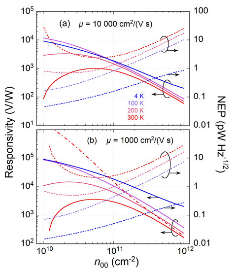 Figure 3 shows the effect of probably the most important parameter, , on ℜ at different and for and . The responsivity significantly increases upon lowering , reaching a competitive value of for graphene with . For a ten times higher , ℜ decreases roughly ten times. However, the advantage of having graphene with high mobility is ten times smaller overall resistance, and 10 k for and , respectively. This is important for impedance matching between graphene and a radiation-collecting antenna. Also, the temperature dependence of the residual charge density (Equation (3)) is significant. Without it, the responsivity gets unrealistically high V/W (see the dash-dotted line in Figure 3b). By dividing the thermal noise voltage variance per 1 Hz of bandwidth () by the responsivity, the noise equivalent power () can be calculated.