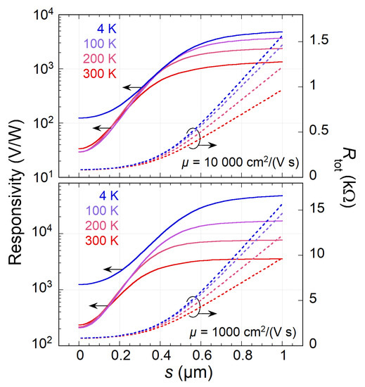 Next, the effect of split-gate separation s is shown in Figure 4. The smearing of increases with s and is followed by a dramatic increase of ℜ at the expense of high . At a relatively large s, the graphene channel is distinctly divided into three parts, p, neutral, and n (see Figure 2a), which is effectively equivalent to the p-n junction extending in space. The increase of responsivity is then largely due to the increased Joule dissipation in the neutral region of graphene.
