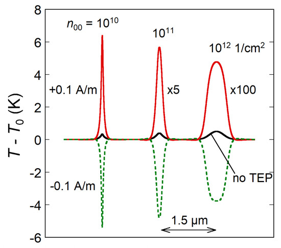 The Peltier effect is obviously dominant in the heating of graphene p-n junctions, especially for sufficiently uniform graphene with . Figure 5 shows the temperature distribution for different . For comparison, there are curves corresponding to the thermoelectric effects switched off. It is noteworthy that the temperature in a p-n junction would change much more dramatically than if only Joule heating were considered. This is also clear from the comparison between the first (Joule) and the second (Peltier) terms in Equation (4). The latter is typically 10–100 times larger than the former at high . This prompts for using p-n junctions in graphene as thermal sources of infrared light [28].