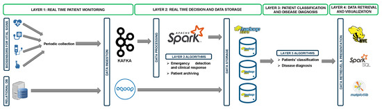 In this section, we present an overview of the different tools and techniques forming the architecture of our platform. Mainly, our system relies on Hadoop ecosystems, which are built on clusters using parallel computing. On the one hand, the cluster architecture ensures a high scalability and reliability of the collected data as well as a fast and huge data storage. On the other hand, the parallel computing ensures a rapid data processing and analysis, especially when the volume of data becomes huge. Furthermore, the architecture of our platform consists of four layers, which allow an entire data analysis process for patients in hospitals, starting from patient data collection and ending with patients’ classification and decision making. Subsequently, each layer performs batch and/or real-time processing. In batch mode, data are first stored in cluster nodes and then processed, while, in real-time mode, data are processed upon collection and before storing. These two processing modes provide a high efficiency in terms of applying any desired techniques (machine learning, artificial intelligence, data mining, etc.) over the collected data.