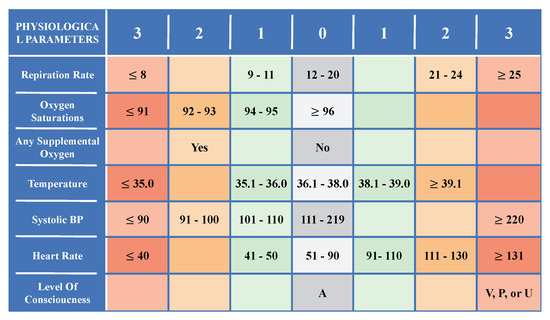 EWS is a guide based on the vital signs, e.g., V, and it is used by the medical staff within a hospital to track the criticality level of a patient. For each vital sign , the collected record is compared to a normal range in order to calculate a score between 0 and 3; 0 means normal record where other values indicate abnormal situations with increasing severity as the score increases. Hence, a set of record scores is calculated for . In Figure 2, we show one of the most used EWS guides that is developed in UK and distributed around all the world, called National EWS (NEWS) [30].