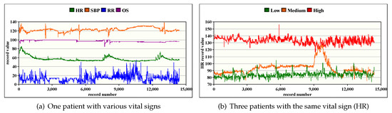 In this section, we show the patient situation progress after storing data in the HDFS which can help in understanding the stability level of each patient. In Figure 4a, we show a portion of record values (e.g., 4 h) for each vital sign of a patient while, in Figure 4b, we only show HR records for three patients with different criticality situations, namely low, medium, and high. The obtained results reveal many observations: First, the stored records for each vital sign of a patient are highly redundant. Second, we can also observe that some vital signs are correlated where the variation/stability of one can influence the others (Figure 4a). Third, we notice that low and high criticality patient situations produce more data redundancy than a patient with medium situation (Figure 4b).