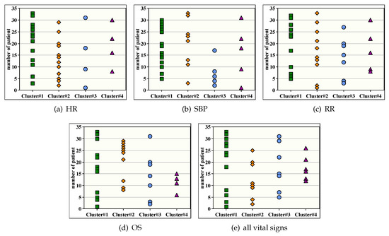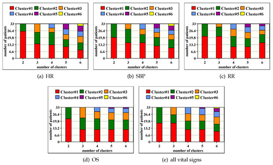 Our objective is to study the SKmeans algorithm proposed at the third layer in our platform for patients’ classification. As mentioned above, classification can be done according to one or all vital signs of the patients depending on the medical staff decision. Figure 5 shows the distribution of patients over clusters after applying SKmeans algorithm when varying K from 2 to 6. We can notice several observations according to the obtained results: First, the patients are not equally distributed into clusters, which confirms the behavior of SKmeans of classifying patients based on their stability level and not in an equal way. Second, clusters approximately have the same number of patients regardless of the monitored vital sign (Figure 5a–d). This confirms the existence of a correlation between the variation of vital signs of the same patient. Third, we obtain similar patients’ classification when applying SKmeans on one vital sign (Figure 5a–d) and all vital signs (Figure 5e). Fourth, we notice that the number of clusters converges to 5 with RR and OS biosensors.
