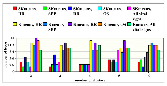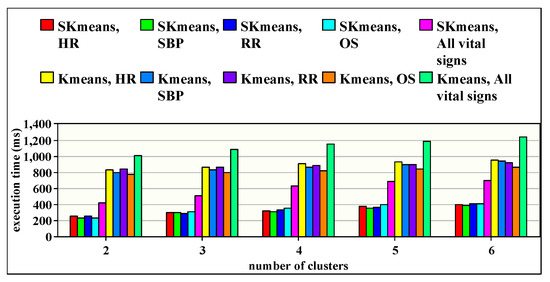 Figure 8 shows the processing speed, or the execution time, required to apply SKmeans and Kmeans algorithms for the various vital signs. Mostly, the processing speed is an indicator to the robustness of any system. In our platform, the processing speed is highly dependent on the iteration numbers shown in Figure 7; the greater is the iteration number, the longer is the processing time required and the lower is the robustness. Since SKmeans algorithm highly reduces the number of iterations, it simultaneously reduces the execution time compared to the traditional Kmeans. Subsequently, SKmeans can optimize the processing time speed up to three times compared to Kmeans.