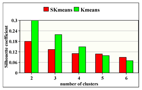 Clustering accuracy is one of the most important metric in order to evaluate the performance of the formed final clusters. Indeed, one can find various coefficients that is proposed in the literature to evaluate the clustering. In this paper, we select the Silhouette coefficient [33] as one of the most popular metrics to evaluate the accuracy of SKmeans and Kmeans algorithms. By definition, the Silhouette coefficient score ranges between (which indicates a low clustering accuracy) and +1 (which indicates a high clustering accuracy) while 0 indicates nested clusters. Generally, the Silhouette coefficient is a composite index that indicates the cohesion and separation of the clusters and can apply several distance measures. In this work, the Silhouette coefficient is adapted to the Euclidean distance that is calculated as follows: