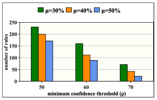 Figure 10 shows the number of mining rules generated after applying association rule algorithm adapted to sensing-based healthcare. Indeed, these rules allow finding correlations between vital signs and thus help the medical staff to understand the disease behavior. The obtained results depend on the minimum support threshold () and the minimum confidence threshold (). As shown, our algorithm allows generating many rules—between 21 and 232—for various values of and . Subsequently, we also observe that the number of rules decreases when increasing or values; however, this makes the rules stronger and more accurate.