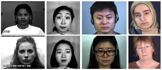 - Valstar, M.; Pantic, M. Induced disgust, happiness and surprise: An addition to the mmi facial expression database. In Proceedings of the 3rd International Workshop on EMOTION (satellite of LREC): Corpora for Research on Emotion and Affect, Marrakech, Morocco, 28–30 May 2010. [Google Scholar]