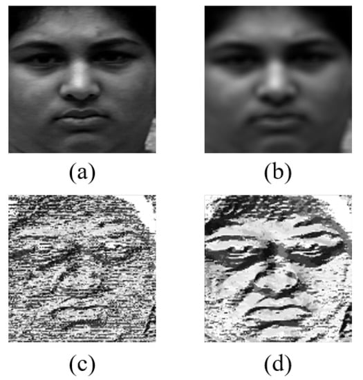 Feature extraction: (a) original image; (b) filtered image; (c) LBP feature without filtering; and (d) LBP feature with filtering.