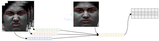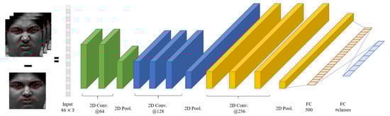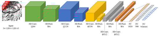 We use 3D convolution for capturing spatiotemporal information. Unlike 2D convolution, 3D convolution captures spatial and temporal information at the same time by using three-dimensional input dataset []. To analyze the movement of face when making a facial expression, motion information should be captured from multiple frames. Since 3D convolution has 3D cube formed convolution kernel, it has one more dimension as the time axis. Thus, it preserves the temporal information of the input sequence and makes volume formed outputs.