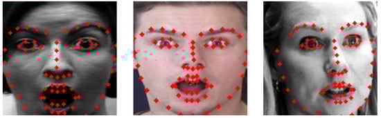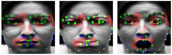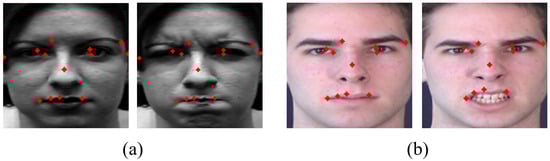 The largest red circle means the largest  and the smaller is the size of the circle, the smaller is the  value. In Figure 7, large movements are mostly captured around the eyes, nose, and mouth. We select the top 13 landmarks among high  value of points as used, e.g, by Liu et al. []. Figure 8 is a representation of these 13 landmarks on samples faces of each dataset. Figure 8a is from the CK+ dataset and Figure 8b is from the MMI dataset.