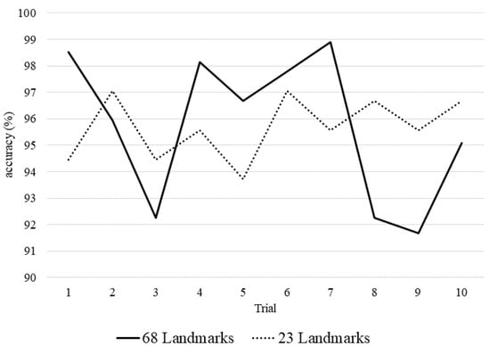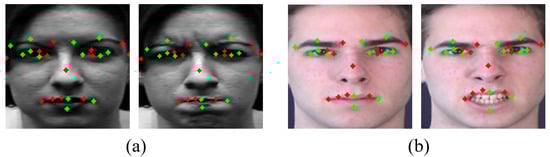 Although this is similar to the main parts used in papers using partial landmarks from faces by Kim et al. [] and Liu et al. [], many movements were also detected in the face outline beside the eye and center of the nose. We designed the distribution of points symmetrically in the dense part. The main part with large difference between expressions are included, but the dominant movement of the whole face can be also considered. Figure 9 shows 23 landmark points including 10 newly added points which take into account the symmetry of the extracted 13 landmark points. As shown in Figure 9, the green marked points are newly added points and red marked points are part of the top 13 points obtained through calculation.